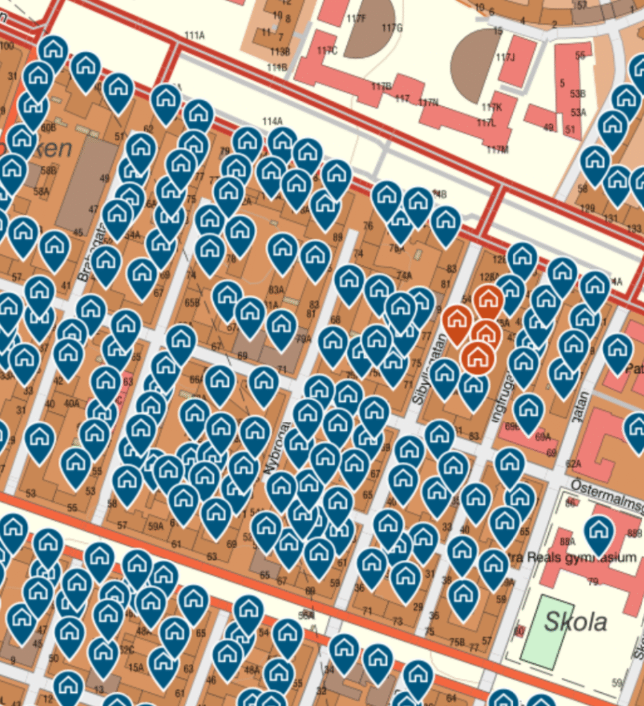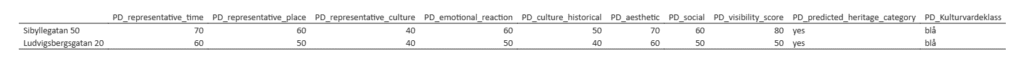 Databasen förvaltas av RISE och är inte offentlig, men nedan ser du ett utdrag vad gäller de byggnader du efterfrågade. Ett värde över 50 har bara enstaka procent av byggnader som har energideklarationer i Sverige. Forskarna som var inkopplade gjorde sedan en finare bedömning av kulturvärden i efterbearbetningssteget. Byggnaderna tilldelades då båda blå klass, i enlighet med Stockholms stads klassificeringsskala.