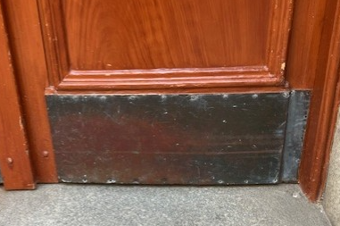 Tvärs över gatan finns hus som inte är byggnadsminne. De kan skydda sina dörrblad med en kopparplåt.