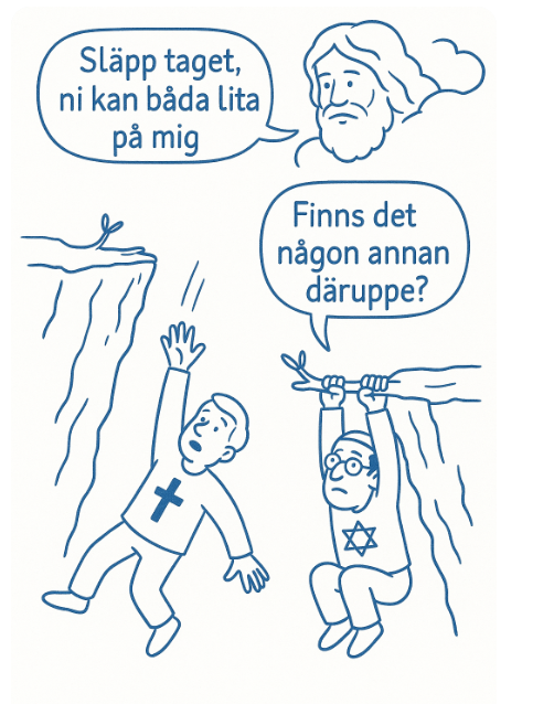 I den judiska traditionen har tron ofta formats genom en lång historia av prövningar, ifrågasättanden och dialog med Gud. Att ställa frågor och söka fler svar är en central del av relationen. Juden i bilden uttrycker därför en annan hållning: ”Finns det någon annan däruppe?”